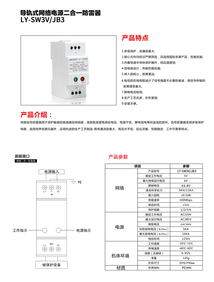 LY-SW3V/JB3 導(dǎo)軌式網(wǎng)絡(luò)電源二合一防雷器